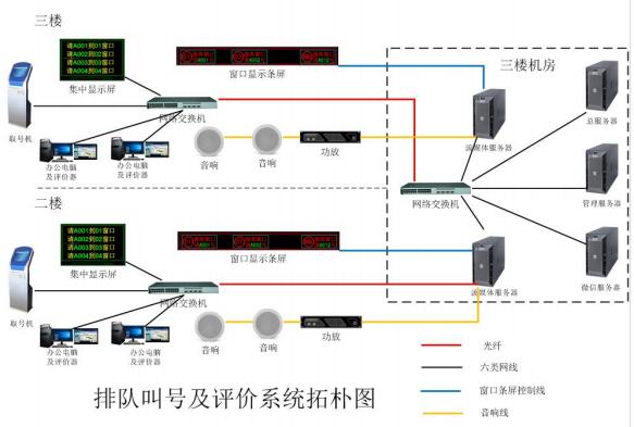 一樓、三樓辦事大廳各設置為一個叫號區域配套大屏幕電視機。一樓、三樓區域安裝取票機 1 臺,二 樓區域安裝取票機 2 臺。各配套大屏幕電視機進行信息集中顯示,以及音響系統進行語音提示。各區域根
